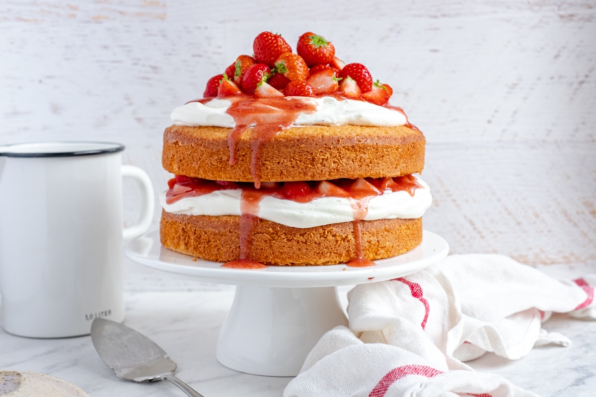 - 5. Leg dan de tweede cake bovenop en herhaal met de slagroom en aardbeien. Werk af met de resterende aardbeien. Bewaar koel tot het serveren.